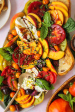 I like to pair mine with crusty bread or toasted sourdough. It’s perfect for soaking up every drop from the juicy peaches, tomatoes, and burrata.