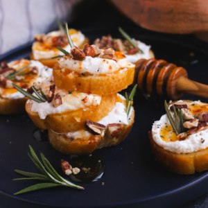 Top your favorite crunchy crostinis with a smooth and creamy layer of whipped feta. Finish them off with pecans, fresh rosemary, and some deliciously sweet and spicy hot honey. This appetizer recipe is perfect for sharing at holiday parties or impromptu gatherings.